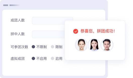 ·商家可自定义成团人数和拼中人数,支持虚拟成团