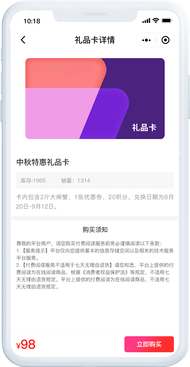 自定义卡面、库存、售价等信息;礼品卡关联兑换码,转赠方便,使用更人性化。