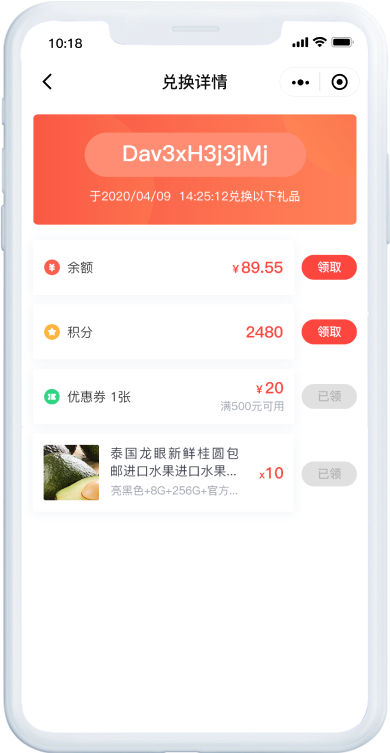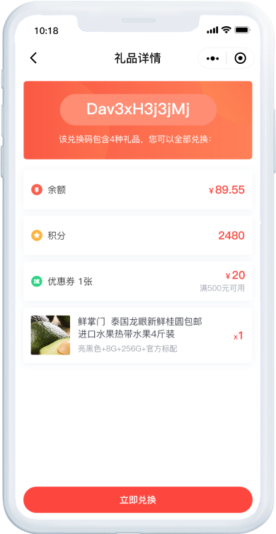 兑换码快速创建,无需手动生成,支持兑换余额、积分、商品、优惠券等奖励品。