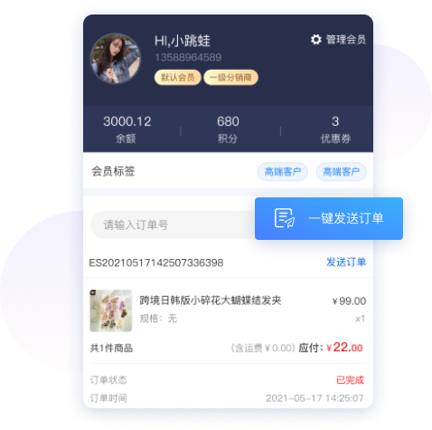 分销商城系统与云SCRM深度结合,会员信息和订单数据全面打通,高效运营私域流量,提升会员转化与复购。